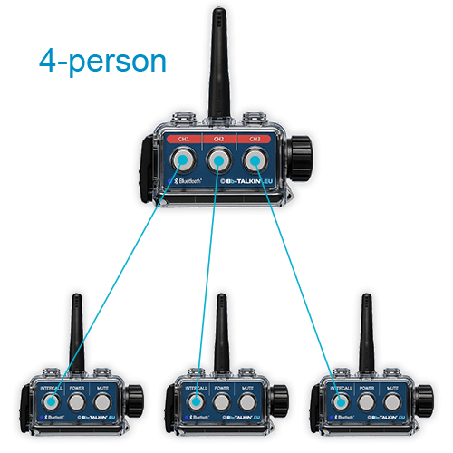 Instruktoři mohou mít plnou kontrolu díky interkomu 3.0 MASTER. Můžete připojit maximálně tři interkomové jednotky 3.0 STANDARD. Hlavní jednotka spravuje všechna propojení a umožňuje tak jasnou komunikaci v reálném čase v rámci celé skupiny.