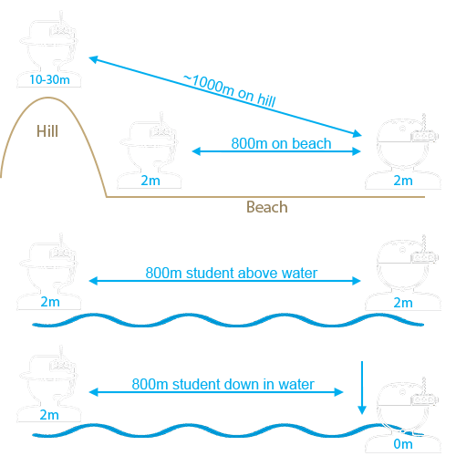 | Umístěno na rukávu (nebo když je student dole) 0 m nad vodou | 400m | 150–250 m | 100–150 m | Nejnižší rozsah; signál těla a vodního bloku. |