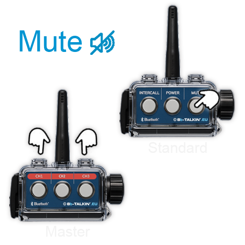 Gli ultimi modelli BbTalkin 3.0 includono un pulsante di silenziamento integrato, che consente il controllo immediato del microfono durante la comunicazione. Il Master è anche in grado di silenziare premendo contemporaneamente Vol+ e Vol-.